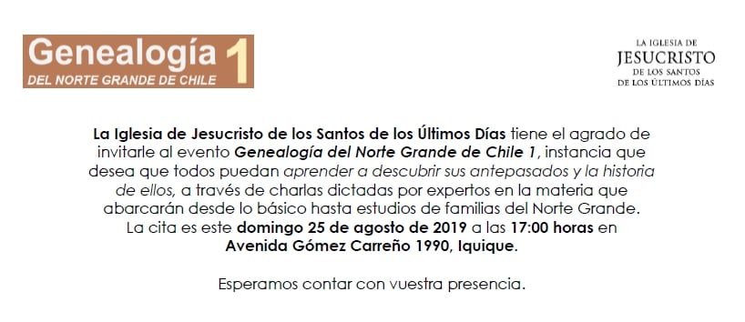 Cecilia Vera, de la Iglesia Jesucristo de los Santos de los Últimos Días; José Alflorino Torres, Experto Universitario en Genealogía y Archivos de la Universidad de Córdoba, investigador de Genealogía de la Universidad de Tarapacá y Gonzalo Luengo, miembro del Número de Instituto Chileno de Investigaciones Genealógicas, autor de blog Genes de Familia, se unen en una charla gratuita este 25 de agosto de 2019, para descubrir tus ancestros y su historia.