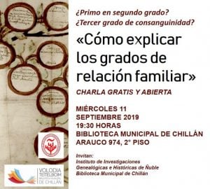 “Cómo explicar los grados de relación familiar” se realizará el miércoles 11 de septiembre de 2019 a las 19:30 horas en el 2° piso de la Biblioteca Municipal de Chillán, ubicada en Arauco 974. Gratuita y abierta a todo público. Invitan el Instituto de Investigaciones Genealógicas e Históricas de Ñuble y la Biblioteca Municipal de Chillán.
