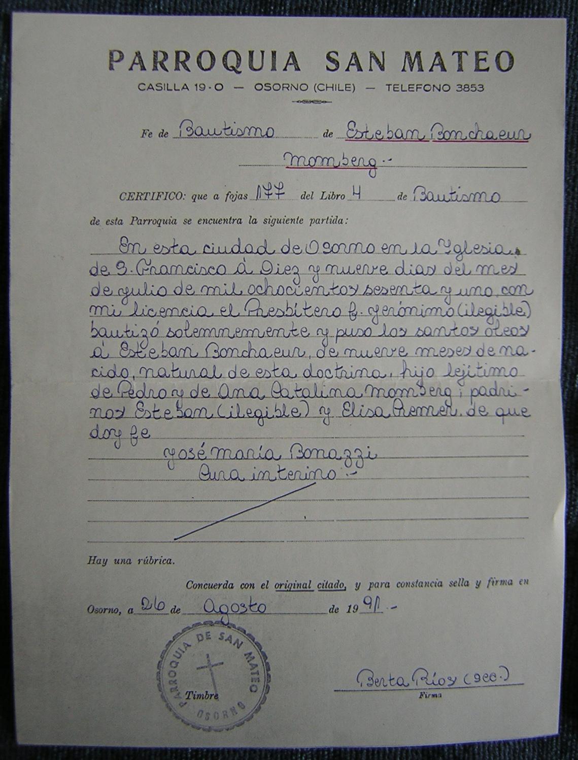 Acta de bautismo de Esteban Bornscheuer Momberg 09 julio 1861. Proporcionada por