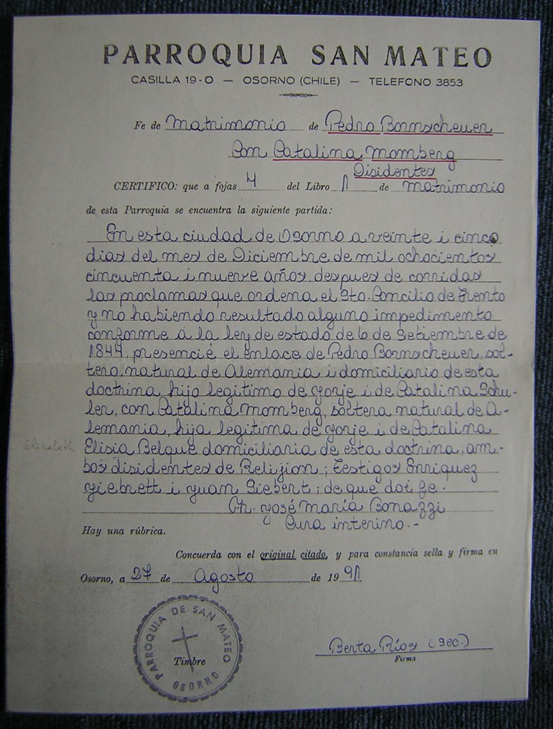 Enrique Bornscheuer Momberg (OSPSMLB), b. Parroquia San Mateo, Osorno, 06 agosto 1872.