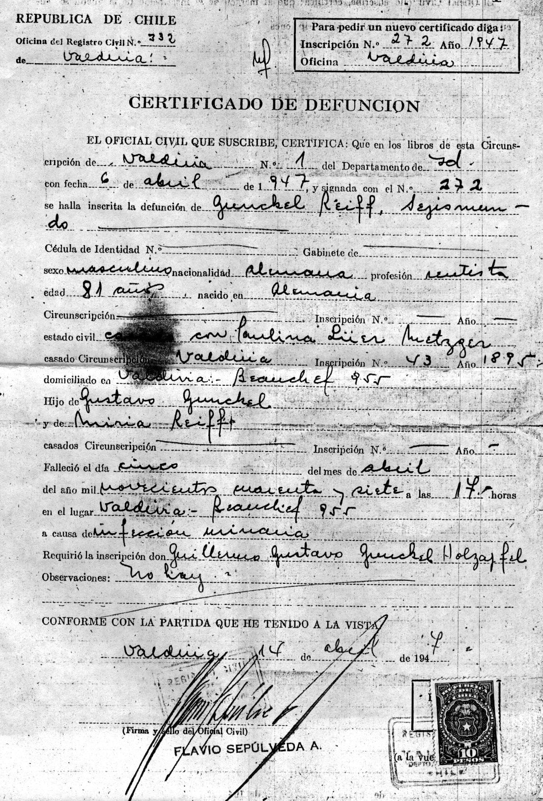 Alwin Güttler (LEGA2002), n. 1875; oriundo de Ebersbach, Sajonia; llegó a Corral con su esposa el 30 julio 1898 en el buque Serapis, bajo el mando del Capitán Richert; ▬ c.c. Berta Mirschwa. Hijos registrados: