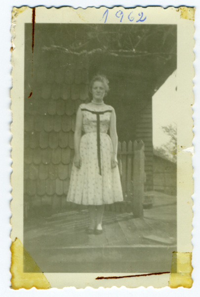 Ruby Hornig Noack en traje de fiesta en el corredor de la casa