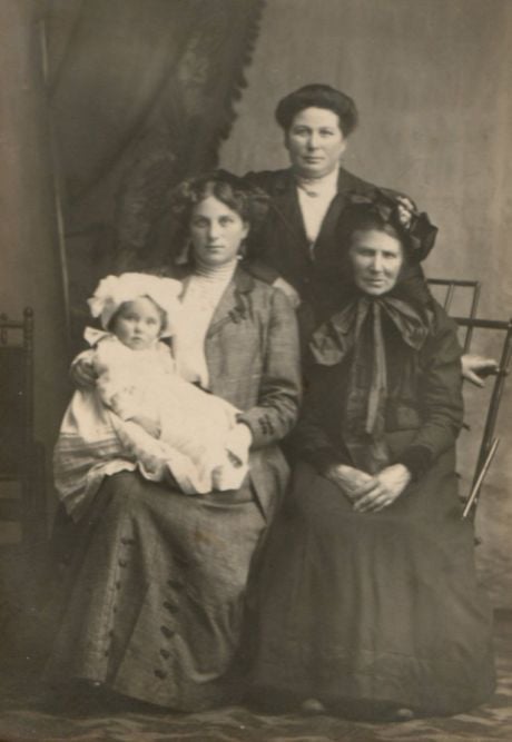 De izquierda a drerecha: Erna Rosa Kunz Buholzer (en brazos), Elisa Buholzer Schraub, Rosina Schraub Feldbausch y Elizabeth Feldbausch