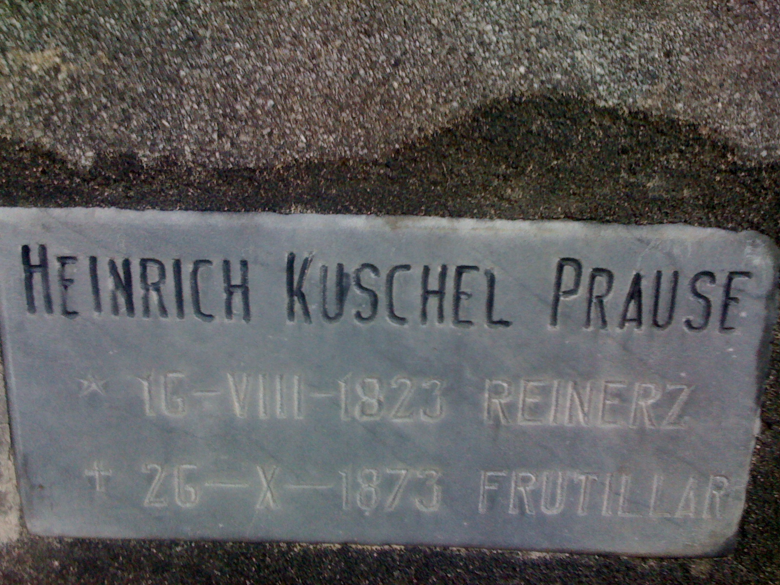Heinricus (Heinrich) Kuschel Prause (LEGA2002), n. Reinerz 16 agosto 1823, b. 19 agosto 1823, + Frutillar 26 octubre 1873, sepultado en cementerio parroquial que donó a la Parroquia Amando Winter; está desarrollado en III.6.