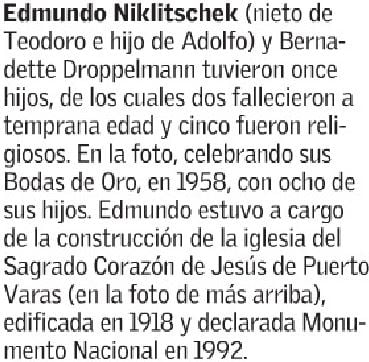 E. Waldemar Niklitschek Kaschel (NIKS1988), n. Río Frío 19 noviembre 1928; c. Puerto Varas 23 junio 1956 c. Nancy Edith Opitz Azócar [n. Puerto Varas 25 marzo 1937]. Hijos: