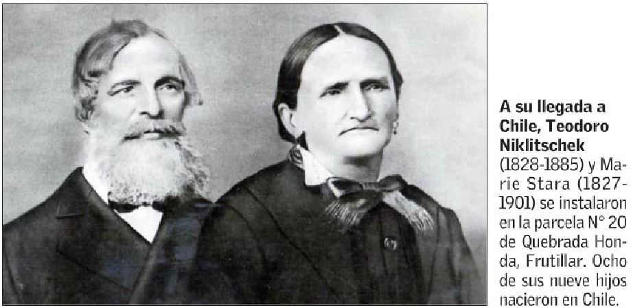 Theodor Niklitschek Klar (NIKS1988;LEGA2002), n. Giesshübel, Boehmen Koenigreich, Austria, 16 abril 1828; + Quebrada Honda, Frutillar, Chile, 18 septiembre 1885; fundador de la Familia Niklitschek en Chile.