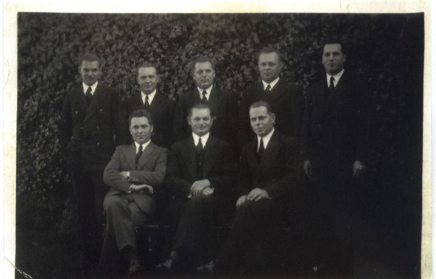 Hermanos Schmidt Hausdorf: sentados (de izq. a der.): Luis, Teodoro, Antonio; de pie (de izq. a der.): Eugenio, Bernardo, Bertoldo, Erich y Germán. Fuente: Jorge Schmidt Wachtendorff.