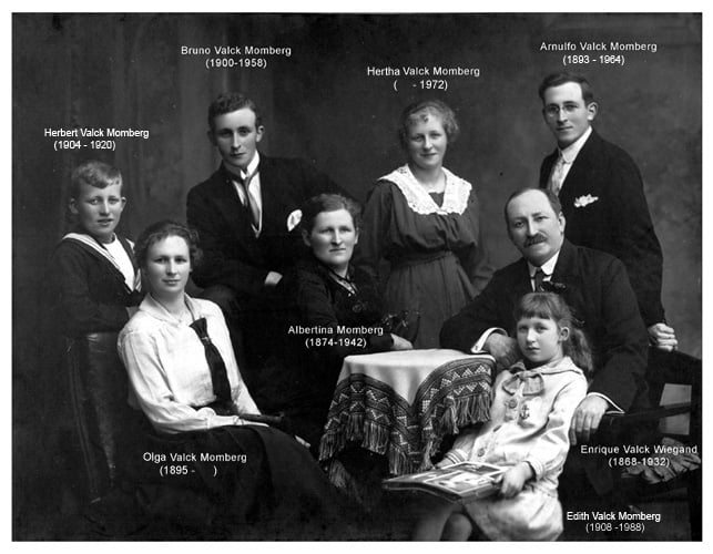 Heinrich (Enrique Segundo) Valck Wiegand (HELD1970;VARCLN;VCA01;FIEN1998;FRAN2002;FINS01;ECHV01;MOMB02;KAHB01), n. 02 julio 1868, + 24 abril 1932; fotógrafo; desarrolló sus actividades fotográficas en Valdivia; ▬ c. 1892 c. Albertine (Albertina) Momberg [n. 04 julio 1874, + 31 octubre 1942; h. Johann Heinrich Momberg Vilka y Katherine Elizabeth Fiegge]. Hijos registrados: