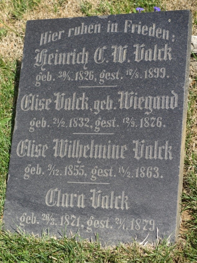 Christian Heinrich (Cristián Enrique) Valck (HELD1970;FRAN2002;KAHB01), n. Kassel, Hessen, 23/30 abril 1826, + Valdivia 17 agosto 1899; zapatero; talabartero; llegó con su esposa Elise Wiegand a Corral el 12 diciembre 1852 en el velero Victoria, que zarpó de Hamburgo el 11 septiembre 1852 bajo el mando del Capitán J. Meyer; "se establece como fundador de una verdadera dinastía de fotógrafos que duró casi cien ańos y tres generaciones; esta empresa familiar se expandió hasta vincularse con estudios en Concepción, Chillán y Valparaíso. Sus hijos Enrique, Fernando, Maximiliano y Jorge Valck, desarrollaron sus actividades fotográficas en Valdivia (FRAN2002)"; ▬ c.c. Elise Wiegand [n. Kassel, Hessen, 21 febrero 1832, + 12 septiembre 1872/1876].