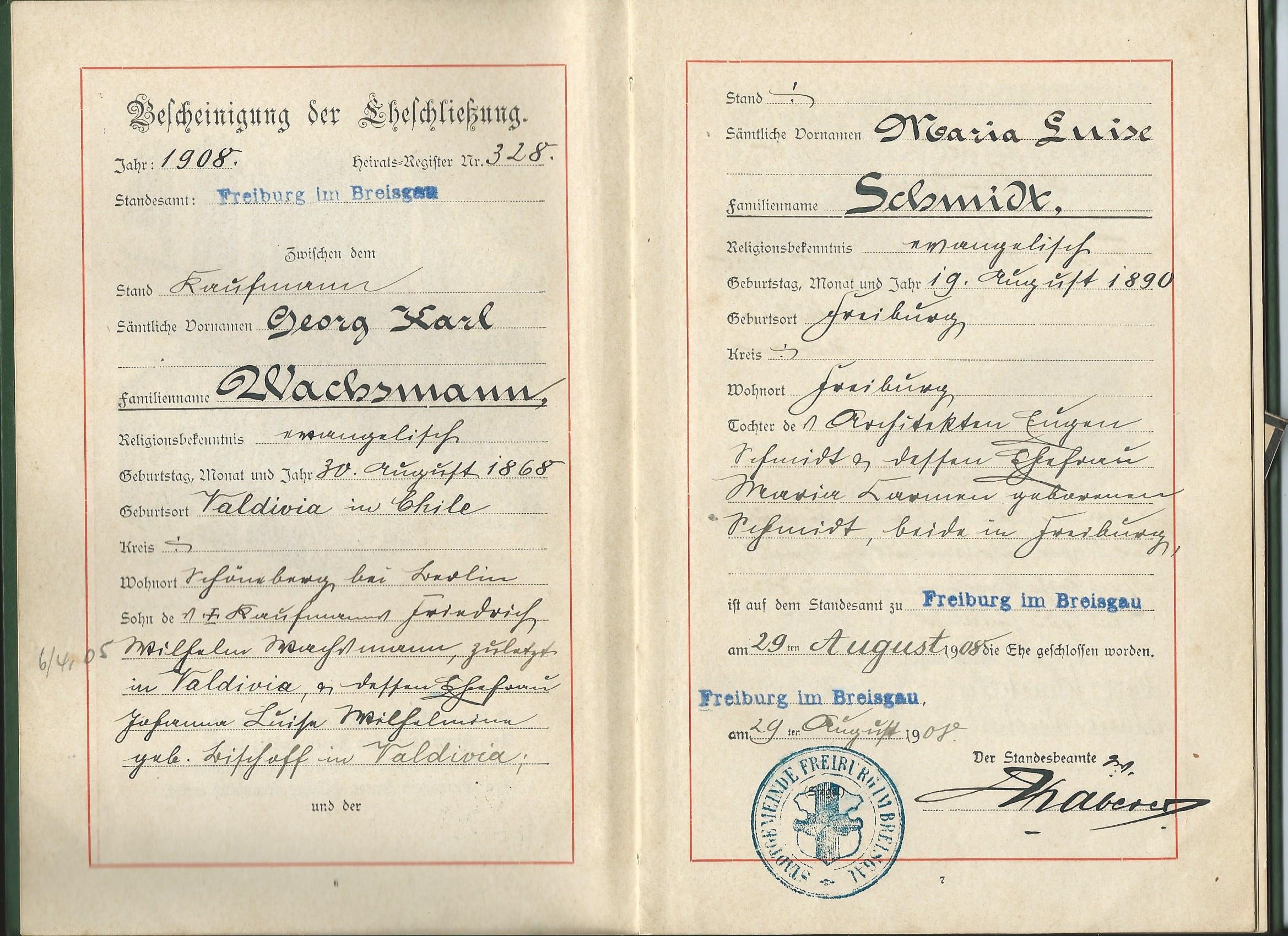 Libreta de matrimonio de Georg Carl Wachsmann y Maria Luise Schmidt. Proporcionada por Helge Cornelius Wachsmann (26 agosto 2014).