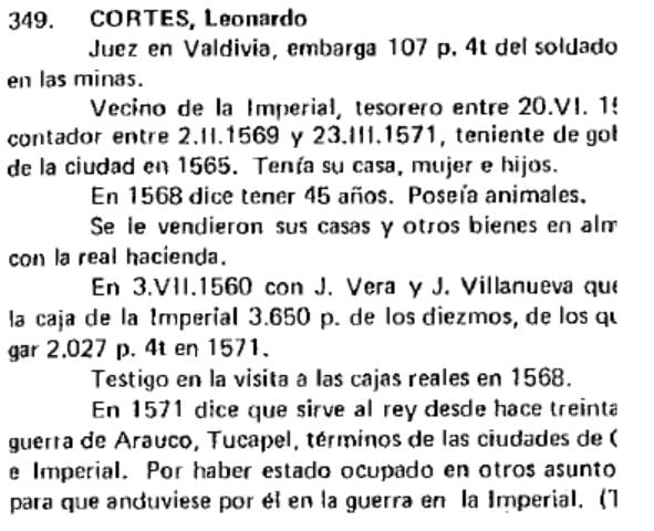 Leonardo CORTÉS (CHAC1992;ESPE1967;ESPE1967;GENCHILE;OPAM1935;MUNC1989), n. Vergara, Valladolid, 1525, + Río de Janeiro 1582 de regreso a Chile como Capitán de uno de los galeones de la armada de Diego Flórez de Valdés, sepultado en hombros de cuatro Generales (Flórez de Valdés, Salvador Correa de Saa, Gobernador de Río de Janeiro, Pedro Sarmiento de Gamboa, Gobernador de Magallanes, y Alonso de Sotomayor, Gobernador de Chile), arrastrando bandas y al son de pífanos y tambores destemplados; Conquistador; venido a Chile en el refuerzo de soldados de Esteban de