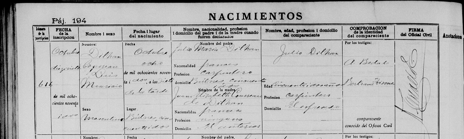 Jean Vital Dilhan (GENEATQ), n. Auterivem 32019, Midi-Pyrénées, 09 diciembre 1874; ▬ c. Oran, Algeria, 21 septiembre 1901 c. Françoise Laveilhé [n. Lamarque-Rustaing, 65253, Midi-Pyrénées, 10 julio 1878; h. Jean Joseph Laveilhé (n. 1836, + 1904; h. Jean Pierre Laveilhé {n. 1807, + 1860} y Anne Soulès {n. 1807, + 1867}) y Dominiquette Fachan (n. 1834, + 1879; h. François Fachan {+ 1839} y Françoise Aubian {n. 1813, + 1870})]. Hijos registrados: