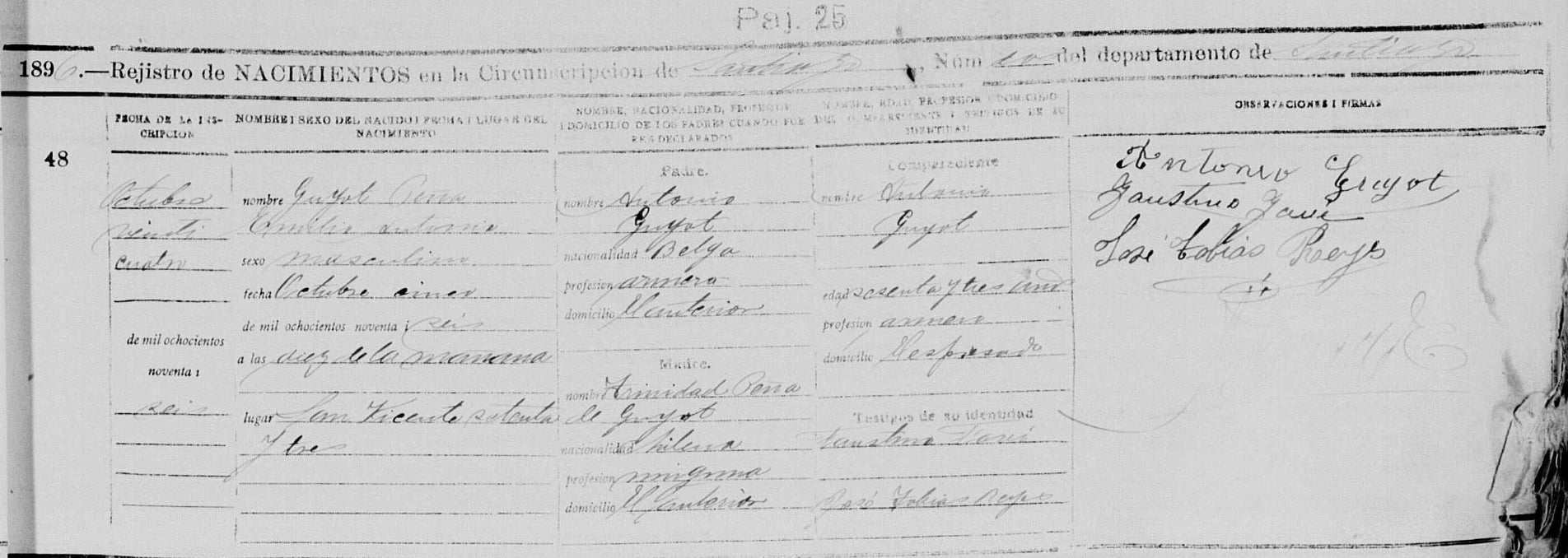 Alejandro Guyot Gilbert (PILC01;FUEB01;PRIV019), n. Marsella, Francia, 1878; habría llegado desde Marsella, Francia, a Argentina con un tío pues sus padres habían fallecido antes, dejando hermanos mayores en Francia; luego llegó a Copiapó y vivió en las salitreras; ▬ c. Tierra Amarilla, Atacama, 26 mayo 1917 c. Mercedes Ríos Sherman [n. San Antonio; h.n. Juana Ríos]. 6 hijos: