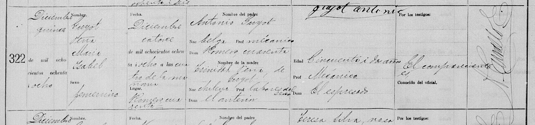 Suzane Juliete Guyot Cuzin (FAMI01), n. c. 1884, + Santiago 10 junio 1965❐ (RC Portales, Santiago, 1965/N°520), sepultada en Cementerio General de Santiago.