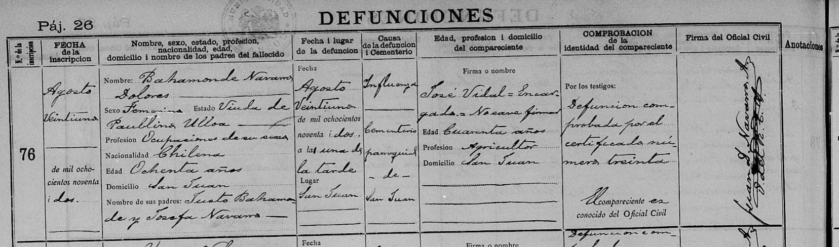 Cayetano Bahamondes Roldán (FAMI02), n. c. 1848, + Concepción 12 septiembre 1898; ▬ c.c. Rosalía Flores Elgueta [n. c. 1865]. Hijos registrados: