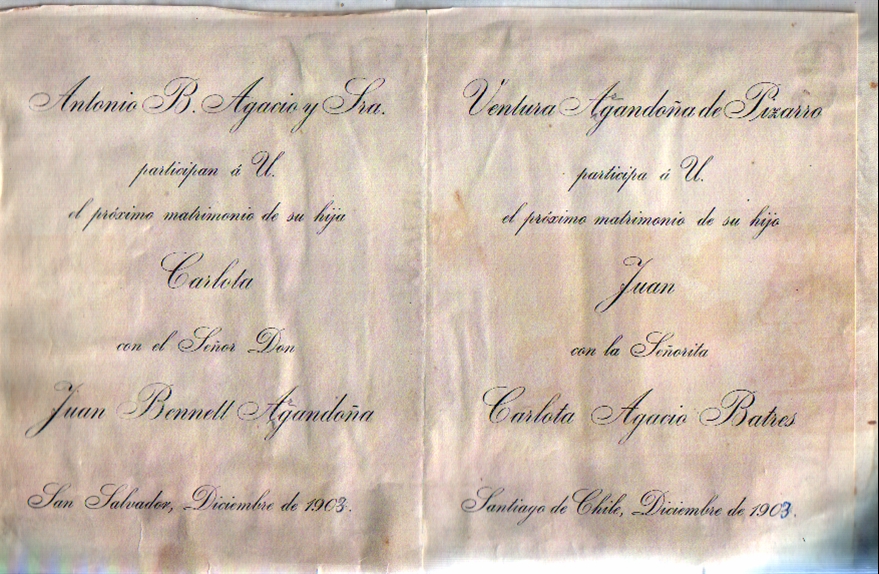 Parte de matrimonio de Juan Pablo Bennett Argandoña y Carlota Agacio Batres. Proporcionado por