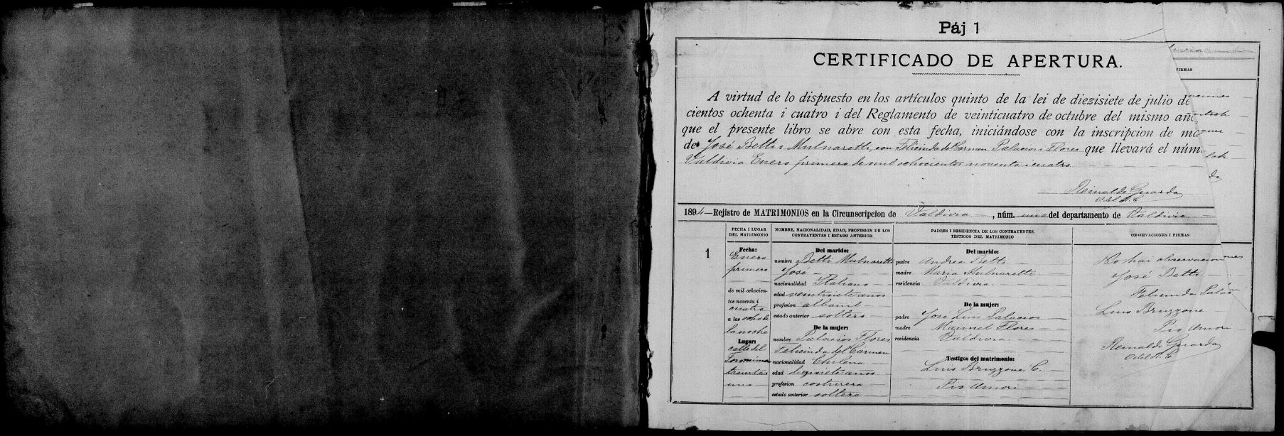 N° 1 (p.1) ■ 01 enero 1894❐ José Betti Mulnaretti c.c. Felicinda del Carmen Palacios Flores